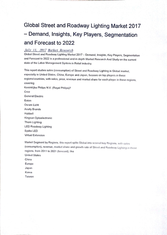 据报道,美国领先的工业与市场研究服务供应商Depth Market Research对全球的路灯市场举行深入的调研,宣布2017年全球路灯市场的视察报告。